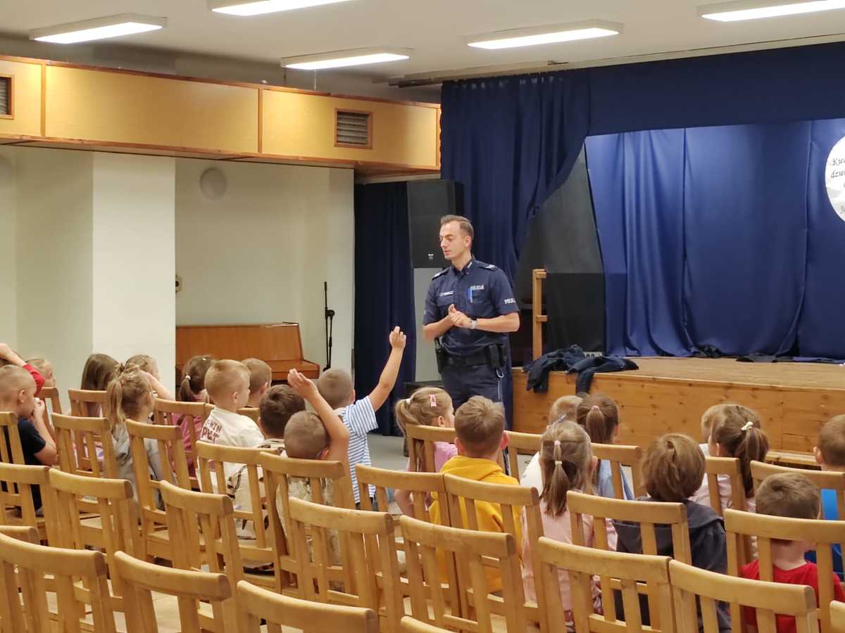Dzielnicowi przypomnieli też o konieczności zapinania pasów w samochodzie i bezpiecznym korzystaniu z komunikacji miejskiej. Uczniowie chętnie zadawali pytania i brali udział w rozmowie, dzieląc się swoimi doświadczeniami z drogi do szkoły.