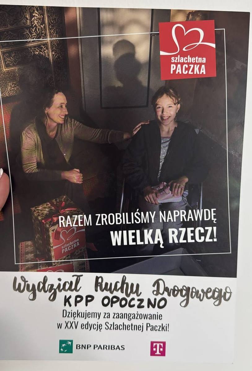 Udział w „Szlachetnej Paczce”, to przykład, że hasło „Pomagamy i Chronimy" ma dla funkcjonariuszy wymiar nie tylko zawodowy. Mundurowi po raz kolejny pokazali, że pomaganie innym jest ważnym elementem policyjnej służby. To wspólna inicjatywa funkcjonariuszy Wydziału Ruchu Drogowego Komendy Powiatowej Policji w Opocznie, policjantów i pracowników Komisariatu Policji w Paradyżu, Prezesa Zarządu Stowarzyszenia „Paradyż Dzieciom” – Moniki Karkochy, społeczności Punktu Przedszkolnego „Dzieciniec” i „Słonecznego Przedszkola”.