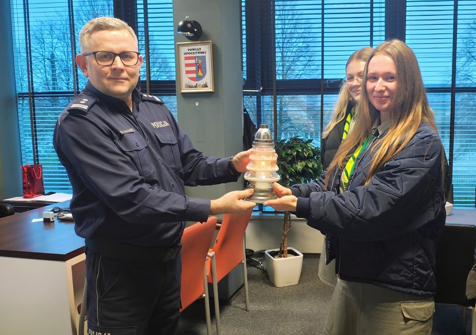Harcerze z Hufca ZHP Opoczno przekazali Z-cy Komendanta Powiatowego Policji w Opocznie, mł.insp. Robertowi Wojciechowskiemu Betlejemskie Światło Pokoju. Harcerska akcja przekazywania przed Świętami Bożego Narodzenia światełka to symbol pokoju, miłości i nadziei.